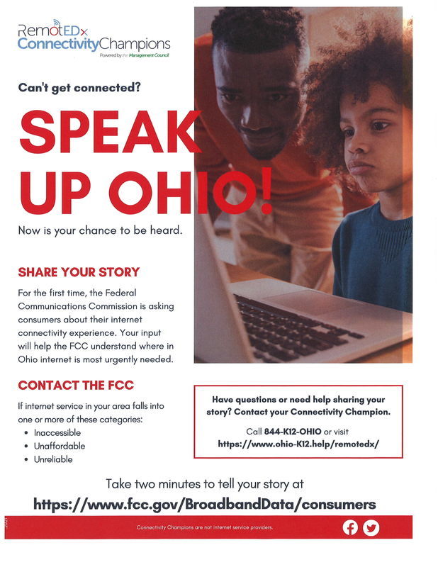 For the first time, the Federal Communications Commission (FCC) is asking consumers, not internet service providers, about their internet experience. Now is the chance for our families to be heard. The FCC will use this data to improve their broadband availability maps. These maps will help internet service providers and governments understand where in Ohio internet service is most urgently needed and decide future funding of broadband services.